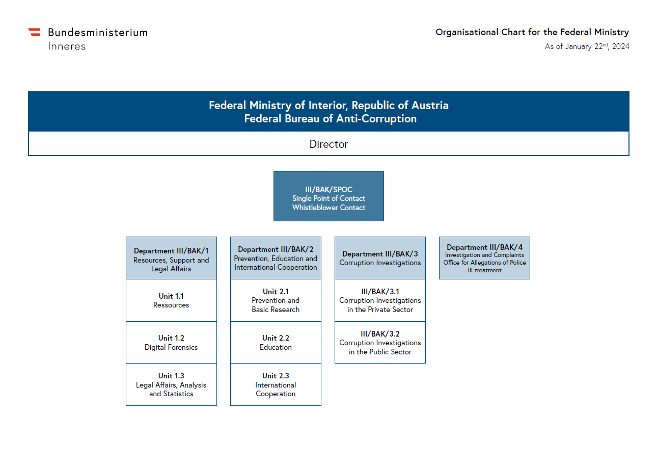 From the organizational point of view, the Federal Bureau of Anti-Corruption (BAK) is an institution of the Austrian Federal Ministry of the Interior set up outside the Directorate-General for Public Security.