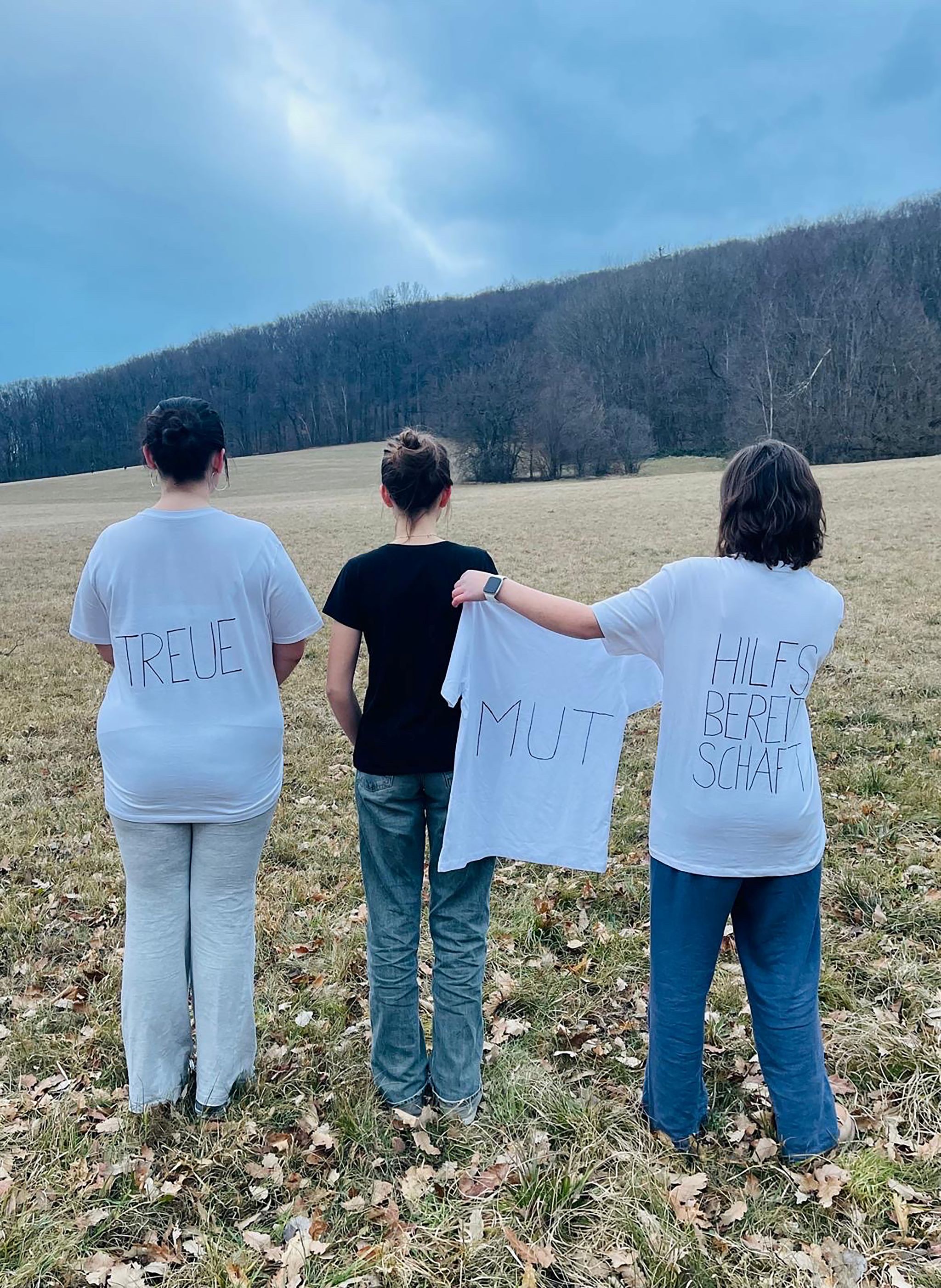 In the photo, three people can be seen. The two people standing on the outside are wearing white T-shirts, in contrast to the person in the middle. The person in black receives an additional white T-shirt from one of the other two. The inscriptions on the T-shirts name three values that match the gesture of each individual. The person handing the T-shirt to the other embodies the value of helpfulness. She responds with empathy and gives courage to another person. Loyalty, in this context, means standing by others even in difficult times. The black shirt represents fear and negative values/emotions. The act of handing over courage illustrates that, no matter how one has acted in the past, there is always hope to find the courage to change and move to the positive side. In the background, an illuminated cloud formation in the shape of an arrow can be seen, which seems to point toward the three people. This underscores the importance and significance of the moment.