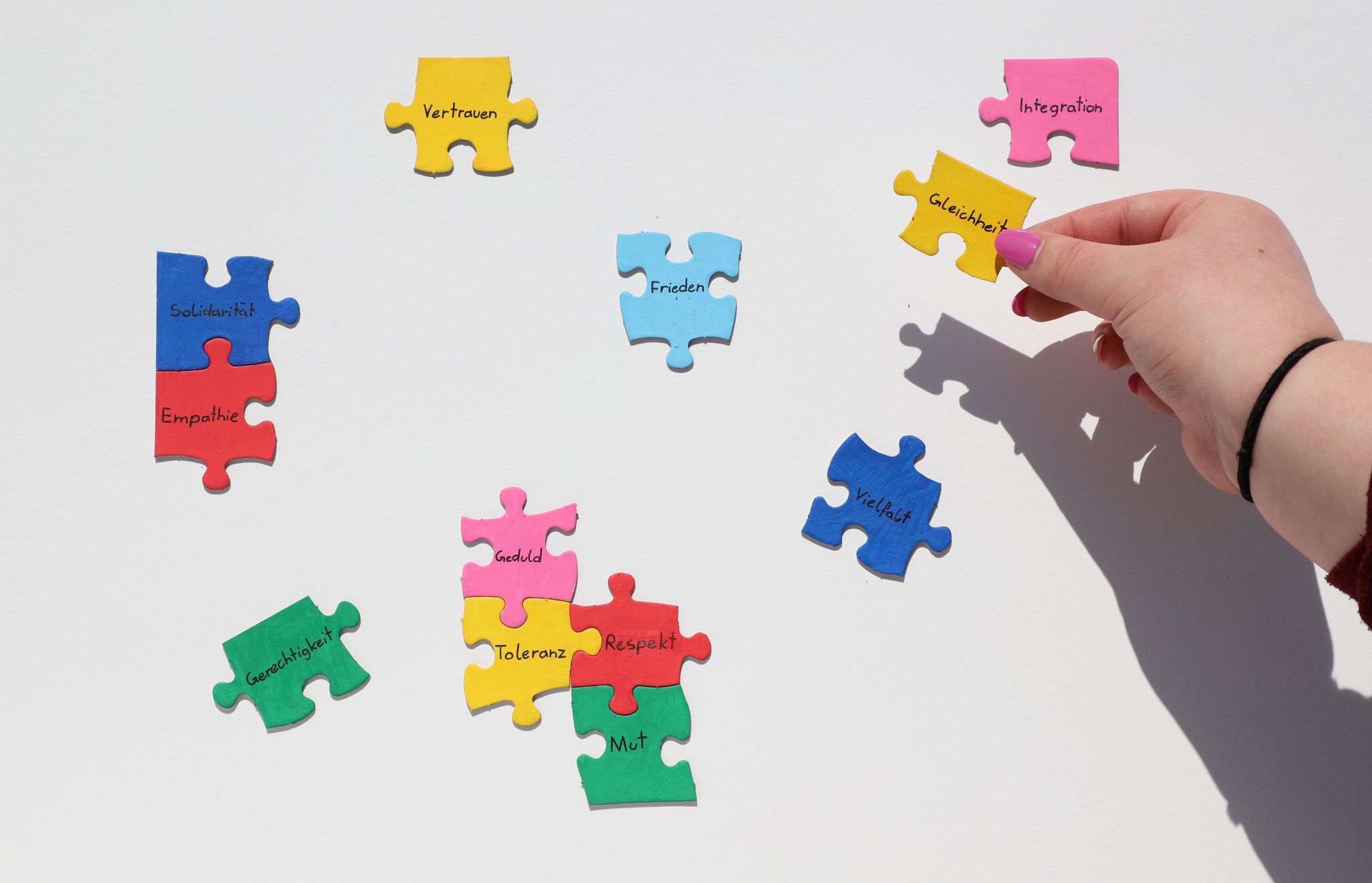 This photo illustrates that our society is built like a puzzle – only when all the pieces fit together does a complete picture emerge. Each individual puzzle piece represents an important value. Each piece is different, reflecting the diversity and variety of values that are important for a community. The puzzle is not yet fully assembled, emphasizing that society can only be complete when all values are united. In the image, a hand is also visible, trying to piece the parts together. This symbolizes the active participation of society in creating a harmonious coexistence. To clearly show that no value should be missing, additional puzzle pieces can be seen that have not yet found their place. These pieces symbolize the values that are still missing, which still need to be discovered or strengthened. The white background does not distract but rather highlights the values.