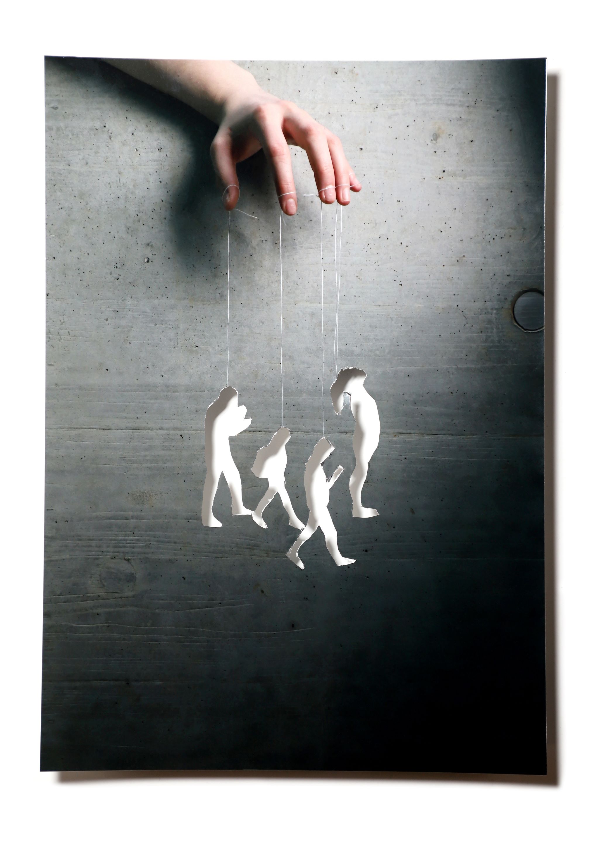 The image was created in several steps. First, a photograph of the hand with threads was taken. Then this image was developed, the silhouettes were cut out, and the whole thing was photographed again to create the final image.