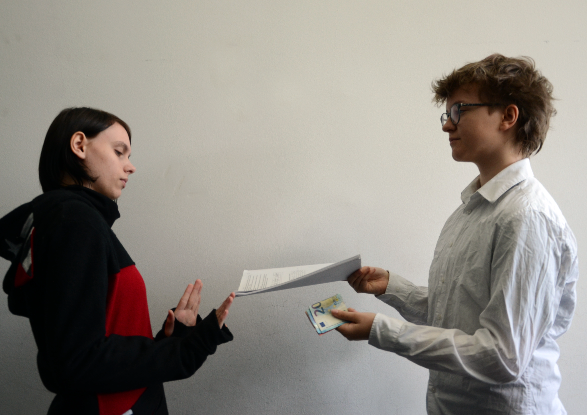 We portrayed the attempt at corruption in two images, like a photo story. In doing so, gestures, facial expressions, and lighting were important design elements for us.