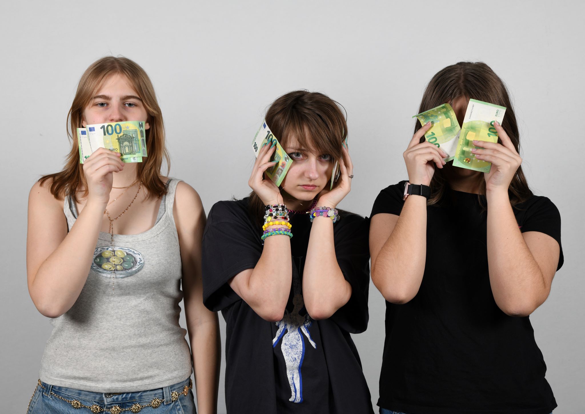 We found our inspiration in the well-known image of three monkeys with covered mouths, eyes and ears. In the first picture, saying nothing, seeing nothing and hearing nothing is achieved with the help of banknotes. In the second image, a person appears like a role model and takes a stand against the influence of money.