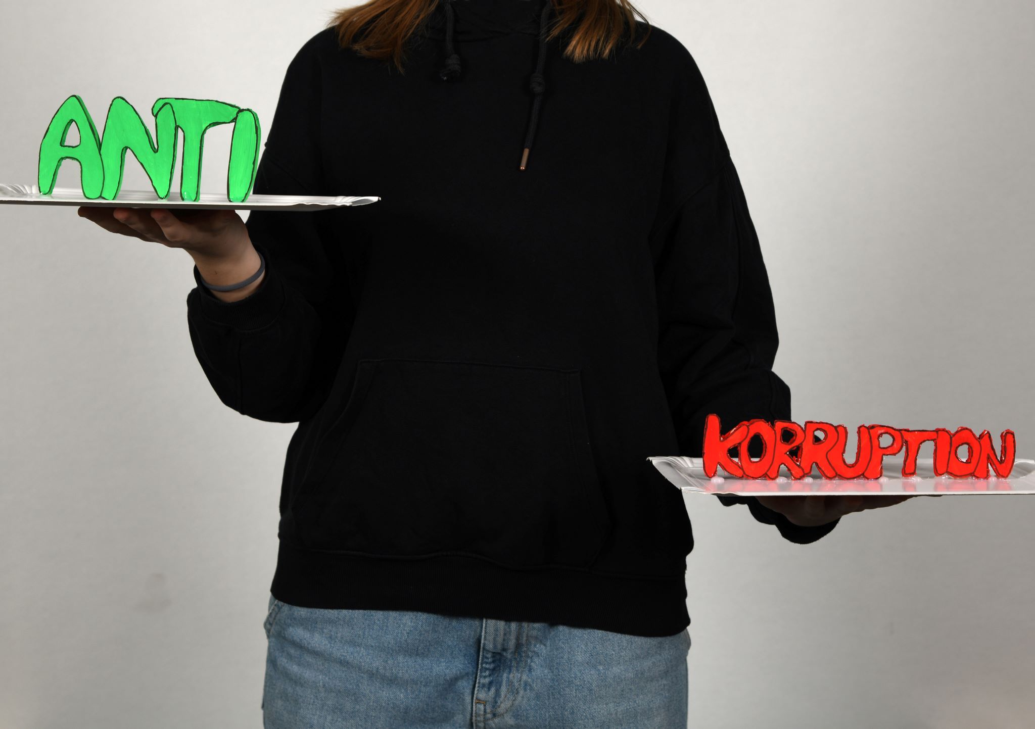 The idea was inspired by separating the word “anti-corruption” into “anti” and “corruption.” In one photo, a person appears like a scale, with the word “anti” symbolizing the fight against injustice outweighing the rest. In the other photo, the person raises the word “anti” in triumph, symbolizing victory in the fight against corruption.