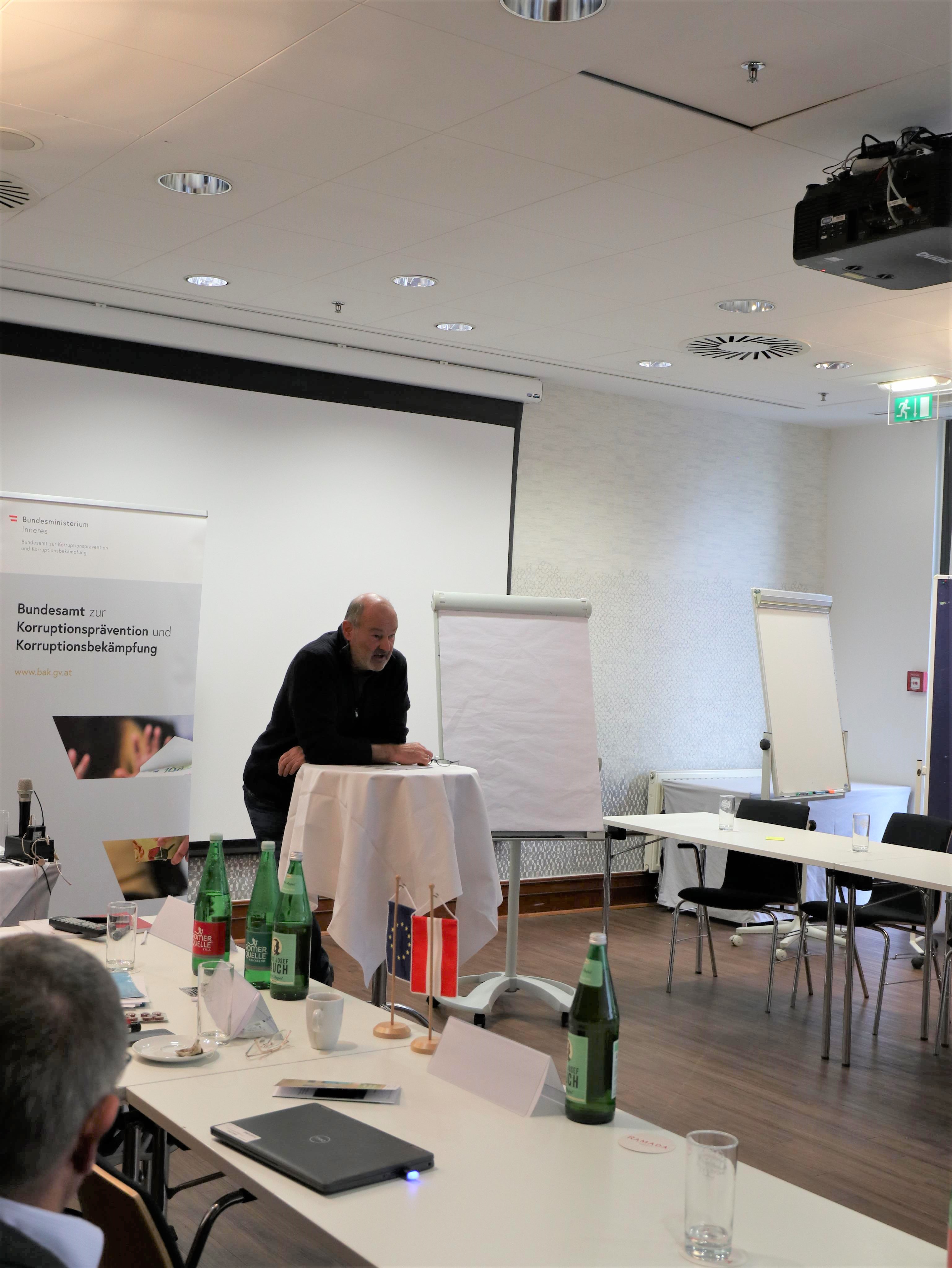 Als Highlight des zweiten Konferenztages diskutierten der stellvertretende Direktor des BAK und die Ermittlerinnen und Ermittler mit den Konferenzteilnehmerinnen und -teilnehmern konkrete Fälle im Spannungsfeld "zwischen Vernaderung und Corpsgeist". Die kriminalpolizeiliche Sicht wurde durch Hon. Prof. Mag. Dr. Thomas Müller um die psychologische Perspektive erweitert, wobei er die häufigsten persönlichen Motive bei regelwidrigen Verhaltensweisen herausarbeitete.