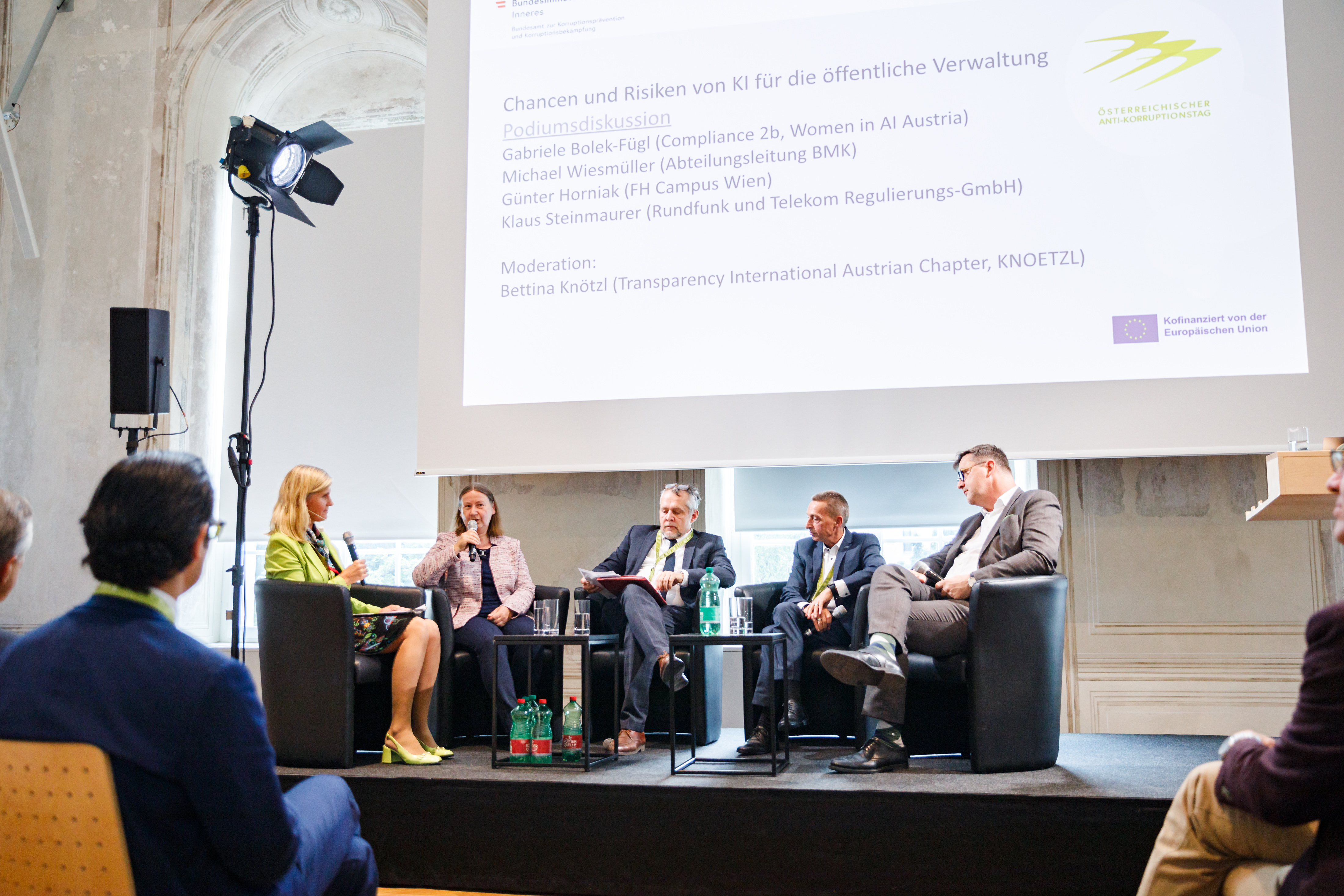 Unter der Moderation von Bettina Knötzl, der Präsidentin des Beirates von Transparency International Austrian Chapter, diskutierten Gabriele Bolek-Fügl (CEO Compliance 2b), Michael Wiesmüller (Leiter der Abteilung Digitale- und Schlüsseltechnologien für industrielle Innovation, Bundesministerium für Klimaschutz, Umwelt, Energie, Mobilität, Innovation und Technologie), Günter Horniak (Leiter des Studiengangs Public Management an der FH Campus Wien) und Klaus Steinmaurer (Geschäftsführer im Fachbereich Telekommunikation und Post der RTR – Rundfunk und Telekom Regulierungs-GmbH) die Möglichkeiten und Gefahren der Nutzung von KI in der öffentlichen Verwaltung.